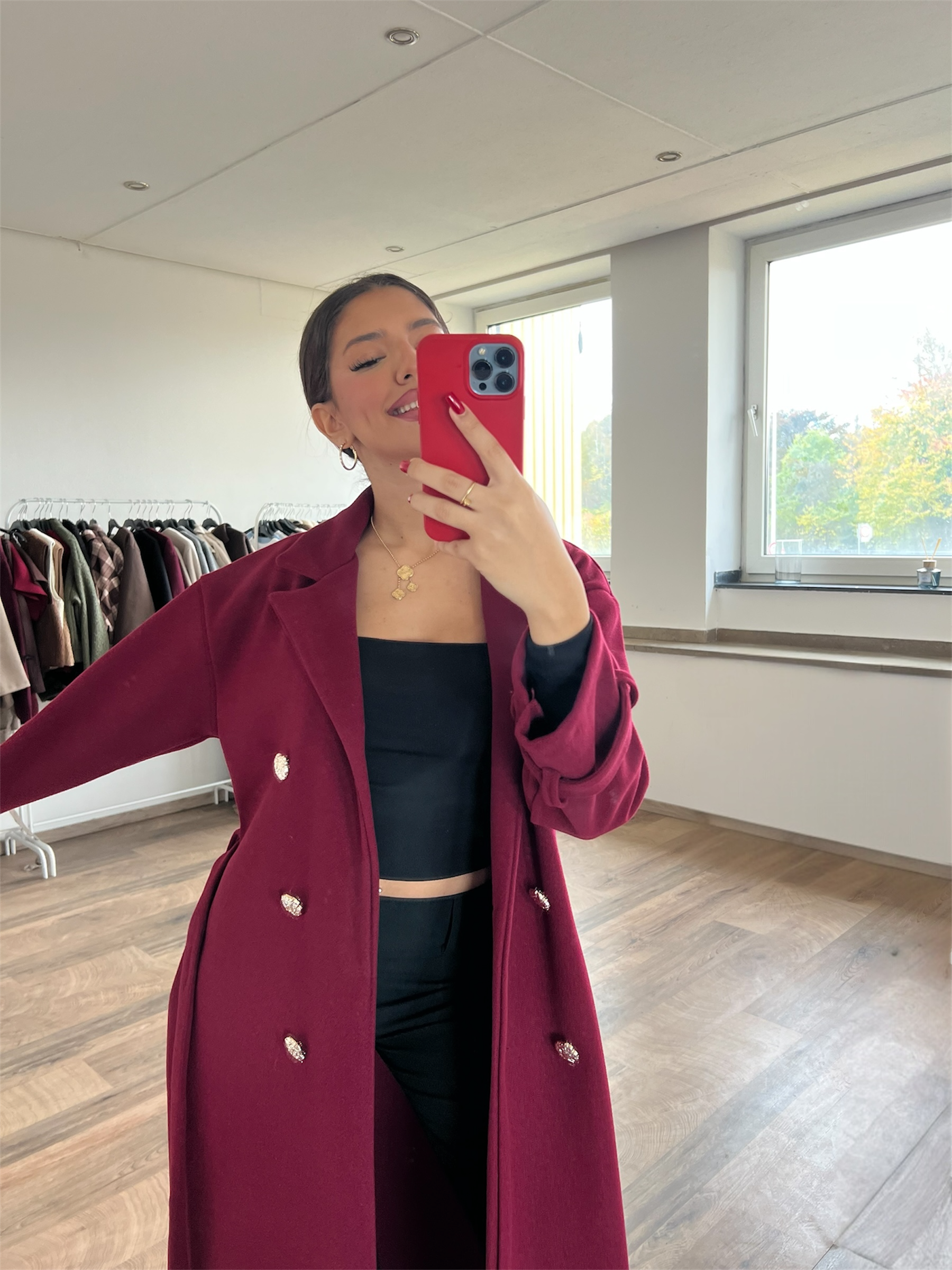 Eleganter, langer Mantel mit edlen goldenen Knöpfen und einer femininen, leicht strukturierten Passform. Warm, hochwertig und perfekt für elegante Alltagslooks, Büro und besondere Anlässe.