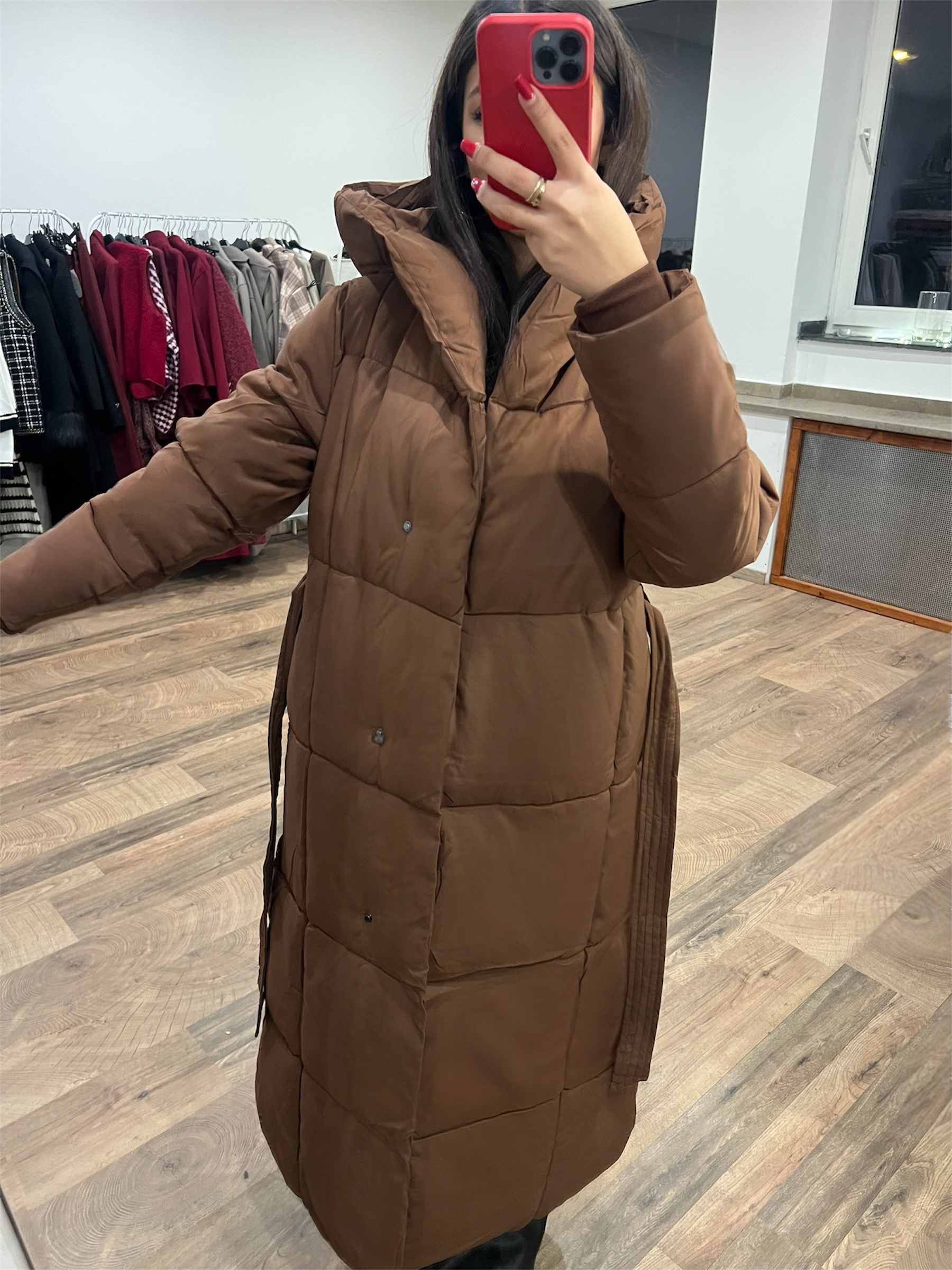 Edler brauner Mantel mit Bindegürtel und großer Kapuze – warm, weich und in trendigem Schokoladenton.